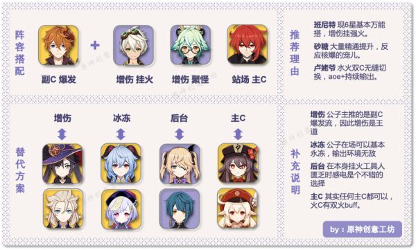 对于平民玩家来说,抽到了零命公子也是可以玩的,这套阵容以打元素反应为主,玩家可以根据自己的角色池来考虑如何搭配.核心的成员是公子和班尼特,另外两个位置可以随意更换。