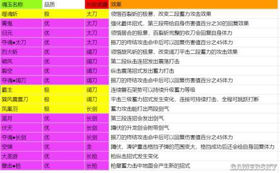 上图是我做的一些关于近战武器的魂玉汇总表格,不过我们今天主要讲太刀,大家也可以留存一下做些参考哟。