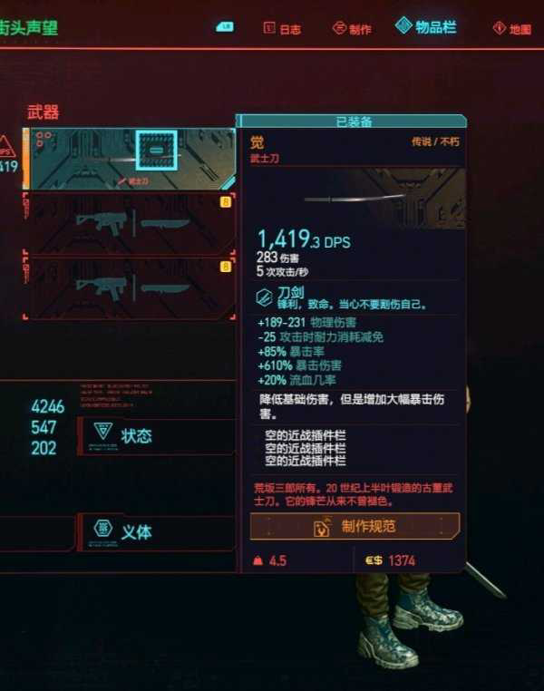 《赛博朋克2077》玩家们能够找到的武器有很多,其中觉就能够在前期获得,然后不断升级,下面请看玩家“信徒同学”分享的《赛博朋克2077》武士刀觉顶级面板属性参考,希望能为各位玩家带来一些帮助。