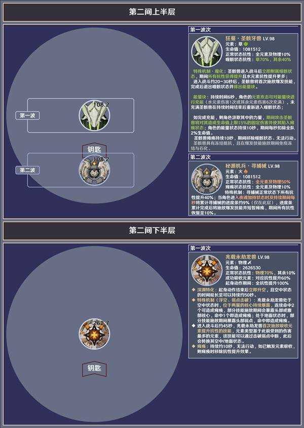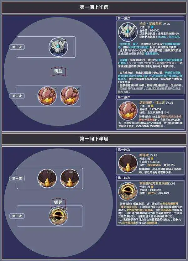 第一间:共两个波次,第一波次对单、第二波次对双,其中第一波次的敌人在进入战斗后会提升所有抗性、且水元素抗性额外获得提升。