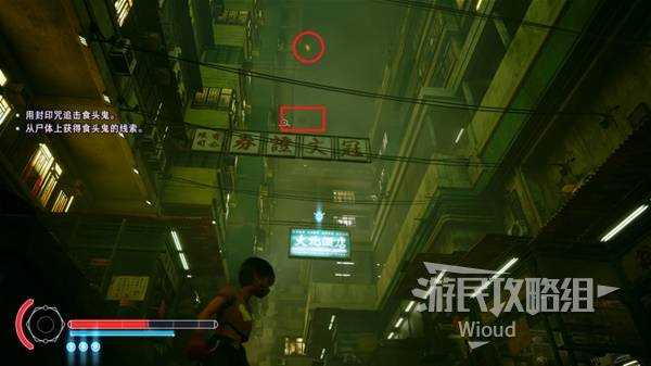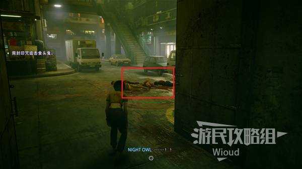 先不要着急上去打,回到下方尸体位置,先直走再左转进入市场,沿着右边的人行道走,前方绿色酒店灯牌右转,进入往夜总会走的那条小道。