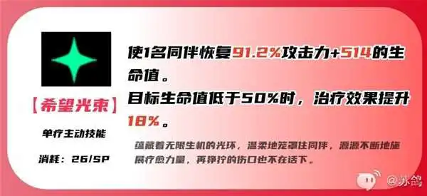 路菲尔的单体治疗技能,对生命值50%的队友有额外的治疗效果,可以控制释放时间,以起到更好的恢复效果。