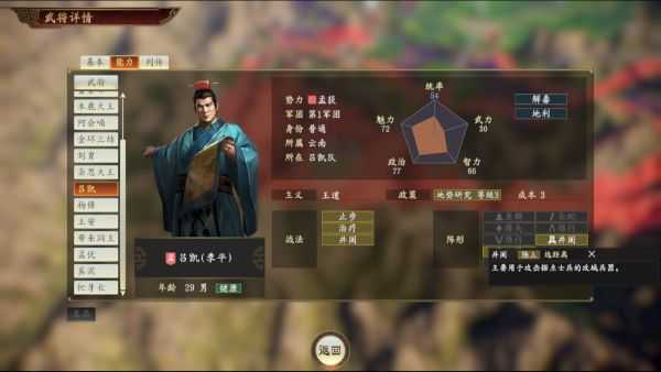 我孟获和土安就一直吃着云南的粮食到处溜达,左边越嵩(不认识读什么)刘备经常派兵来占,我土安基本上从后断起粮道,无伤杀敌,其实带个带奋战,突击之类的去溜达更好,挂个技能,一招秒敌,当初想着藤甲肉一点,可以溜达久一点,但是其实对A始终要掉兵,技能秒敌反而不会有战损。
