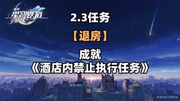 《崩坏星穹铁道》退房是2.3版本新增的冒险任务,任务完成后还可以获取酒店内禁止执行任务成就,下面请看由“江同学up”为大家带来的《崩坏星穹铁道》2.3退房冒险任务攻略,希望可以帮助到大家。