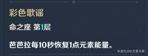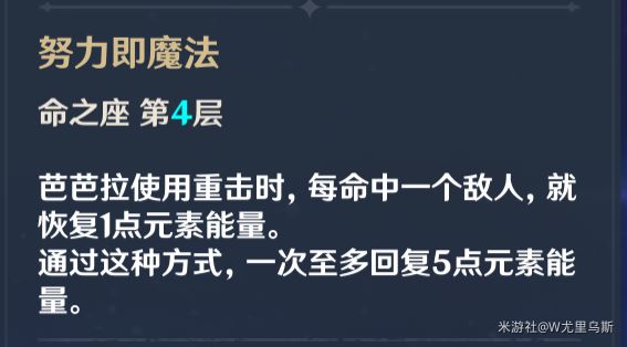 芭芭拉使用重击命中一个敌人就能回复一点能量,,这种方式最多一次回5点。这个命座也是为了加强芭芭拉的大招充能速度。不然充的真的慢。