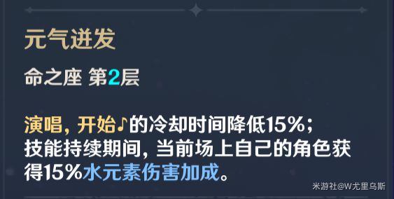 元素战技冷却时间降低15%这个挺不错的不然冷却时间很长,然后技能存在期间,还会为当前自己的上场角色获得15%的水伤。