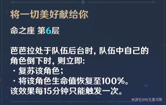 起死回生!不过15分钟触发一次,感觉没怎么用到过,可能对于新手来说这个命座还算不错,是一个救命的稻草。