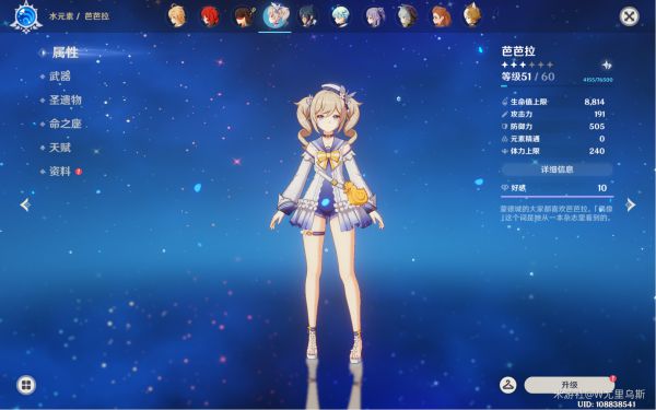 总结:说了那么多,也就是想表达,前期开荒带芭芭拉,还是非常吃香,省药省跑神像。不过遇见会放冰元素攻击的怪就很烦了,比如,愚人众冰胖子。不过也不用投入太多去练这个角色,过渡一下这样子。