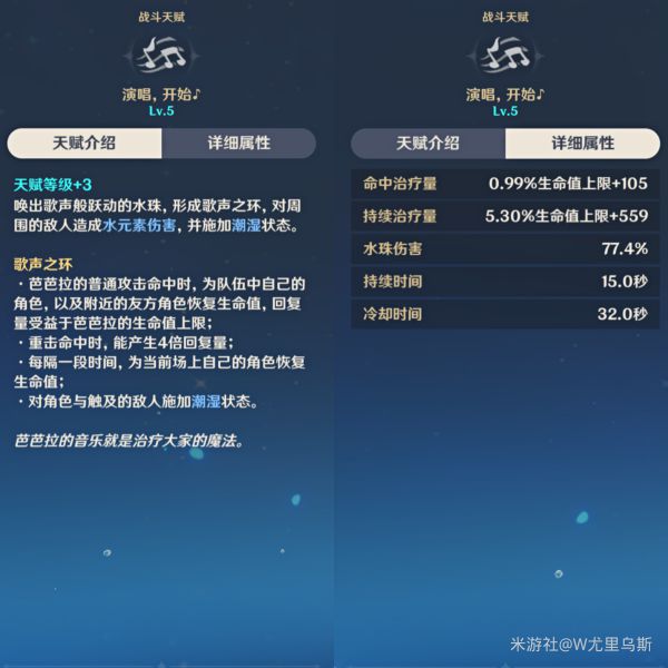元素战技持续时间15秒,预计4秒左右奶一下。奶量是根据生命值上限来计算,重击命中还能回能。元素战技存在期间芭芭拉普攻命中也可以为全体队友回复生命力。缺点:会给自身水元素附着,内鬼自己,比如你被冰元素怪物攻击了,那么芭芭拉的技能会导致你自身被冰冻起来。