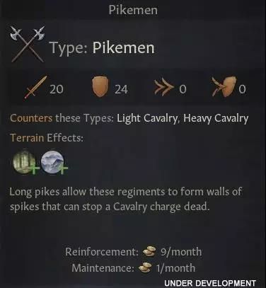 武装兵士等同于CK2中的常备军,是受训的正规军,因其各有特长而被划分为了不同的兵种。基础兵种诸如轻骑兵与重步兵是通用的,谁都可以招募。但更引人注意的自然是那些专属于特定文化或地域的兵种,他们在属性与功能上都会有所不同。而说到武装兵士的属性,在本作中,你统共需要关注四个数值: