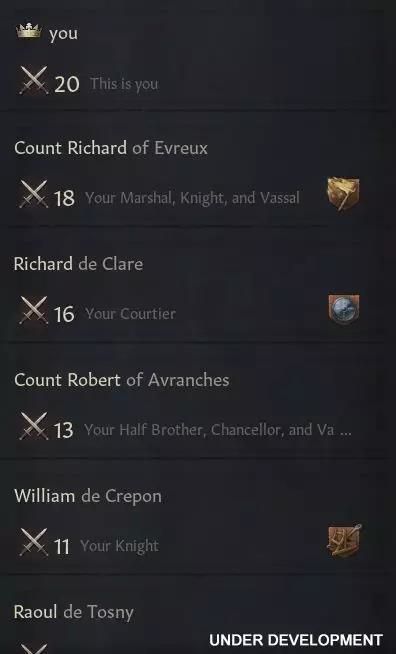 你可以使用的军队不仅仅包括征召兵和武装兵士。作为一个领主,会有一些骑士愿意随时听你差遣。骑士就是你领地里那些战斗能力高超的封臣和廷臣,战斗能力相当于CK2里的个人实战能力,代表一个角色战斗的能力,并在他们参加战斗时适用。一般来说,你只能拥有几个为你献身的骑士,但是你可以通过很多方法来增加你控制的骑士的数量,以及提高他们的战斗效能。