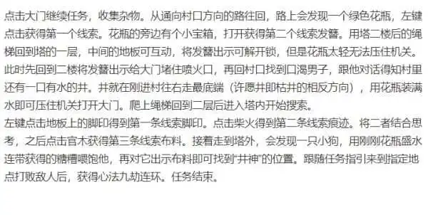 进入后可发现传闻中提到的张家小姐和奶娘。旁边的地上还有一把剑可以互动,但是非常以及极其特别的难点,我强烈要求制作组改一下,我几次反转在纠结这玩意到底能不能互动。拿着短剑回去找可疑人士,对他出示可继续下一阶段。回到刚刚发现人和剑的古井旁边,疑犯就在那等你。解决他之后传闻完成。