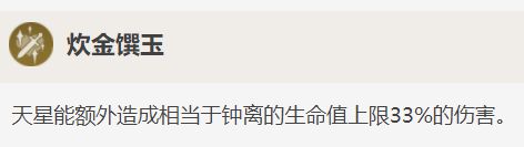 讲完了护盾,我们再说一下钟离的大招,钟离的大招也是被广大玩家所诟病的点,说实话,我一开始看见这个大招之后就在脑海里脑补出了斑爷抱着胳膊霸气地喊了一声:天碍震星——,不过实装了之后,基于岩属性的无联动加伤的特性,这个大招的伤害比例不算是特别高,哪怕是加上钟离的另一个天赋