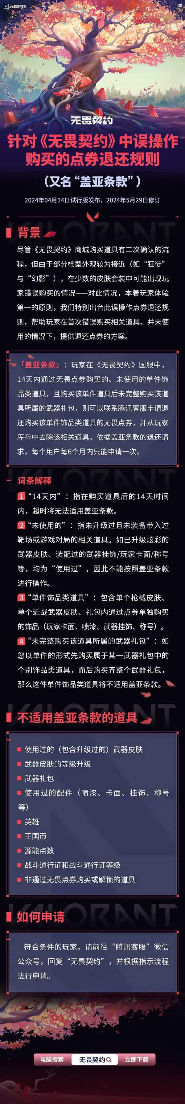 目前,“盖亚条款”仍处于试行期内。根据条款的适用性和规则我们将可能随时做出调整。两个多月前,全球其他区域版本的《无畏契约》更新了退还规则,该规则中将涉及先购买单件属于捆绑包(国服称为”武器礼包“)中的个别道具、后补齐购买完整捆绑包的退还规则做了更新,更新后该种情形将无法适用退还规则。