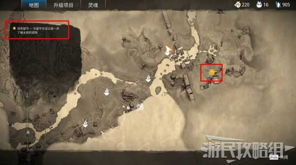 地图界面左侧显示当前的任务目标,目标位置会在地图中用黄色圆点标记出来。