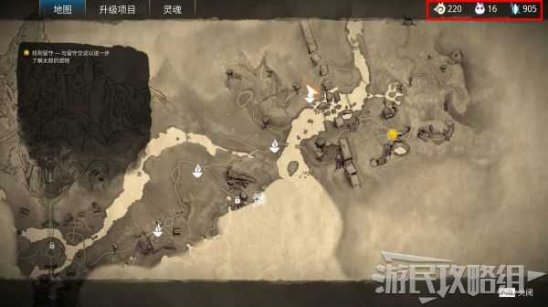地图界面右上角显示我们当前所拥有的业力和钱数量,以及当前队伍中携带的腐灵数量。