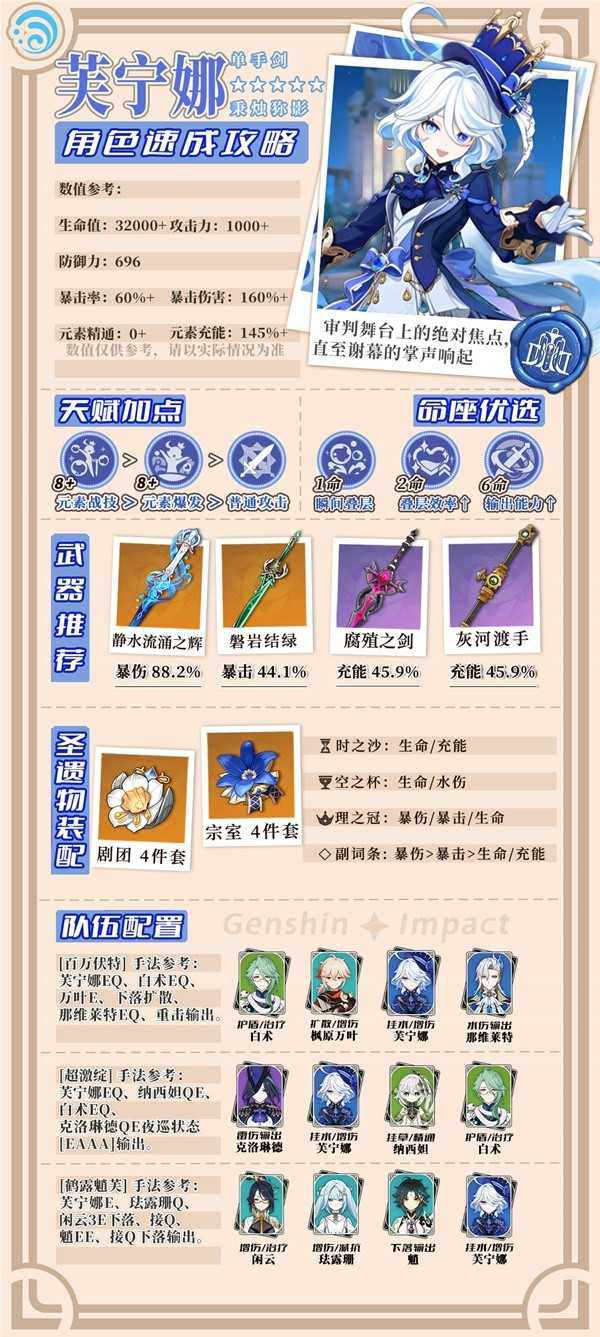 [芙宁娜]是一位同时兼具后台输出、治疗与增伤为一体的水元素功能性角色,有着极高的泛用性。