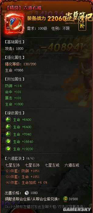 通过[卓越炼化]功能,可以提升装备的基础属性、附件属性加成。另外,炼化后的装备将获得一条卓越属性,以六道右戒部位,参见下图: