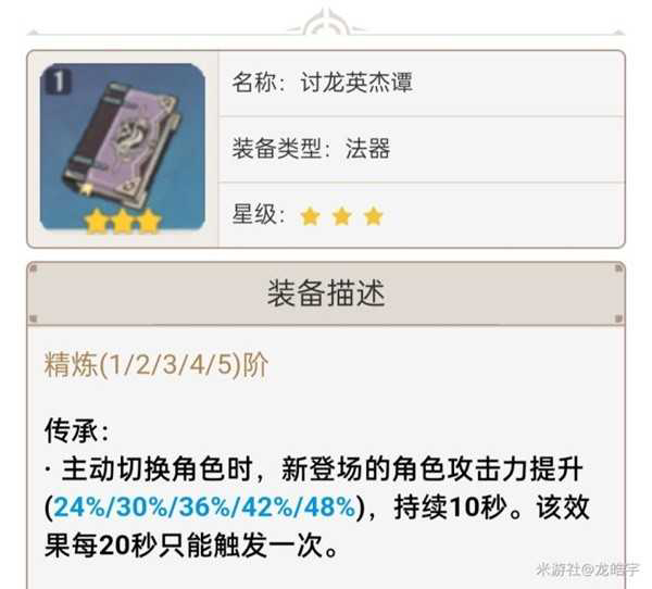 其在速切阵容表现良好,作为真五星神器,讨龙英杰谭的辅助能力诸位是有目共睹。关键是它是非常好获得的,不管哪个池子,随便点几发一大堆,可以说非常好用了。