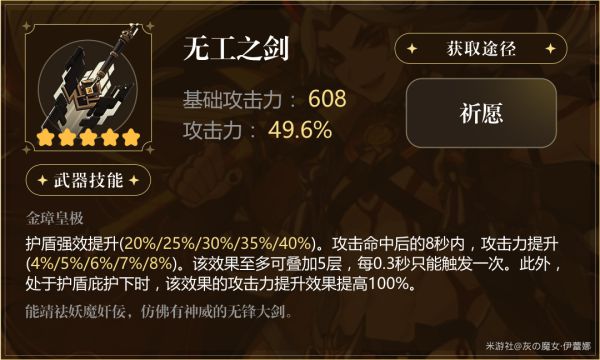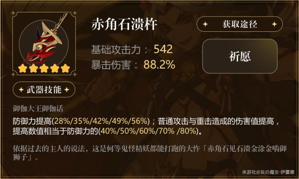 现阶段最契合且毫无疑问的一斗的指定武器。比起其他武器对于一斗的增幅程度可以说是一骑绝尘。副属性88.1%暴伤,是继磐岩结绿之后第二把低基础攻击力超高副属性模板的五星武器。武器特效大幅提高了一斗对防御力的利用率(普攻伤害提升约19.3%,重击伤害提升约16.5%)堪称一斗的必需品。随着精炼的提升与其他武器的差距会进一步扩大。