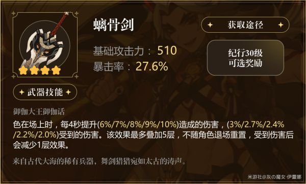 除去赤角外现阶段最好的替代品。然而如何保证武器特效层数是个难题。实战中不绑定钟离/其他盾辅的情况下很难保证层数。如果有满精的话会是个不错的下位替代。(满精螭骨叠满层数大致相当于1精赤角)