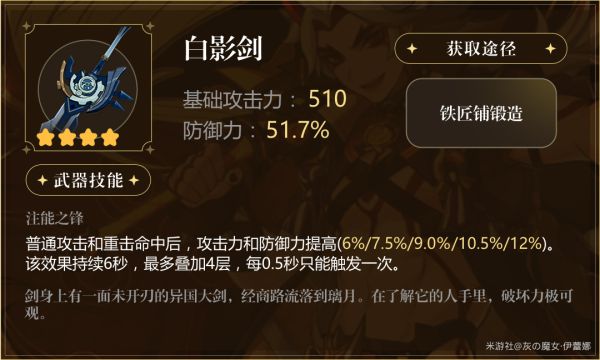 不推荐。理由与白影剑类似,武器提供的额外攻击力被严重稀释,能带来的提升远不如相同权重的暴击暴伤/增伤。请不要产生“好歹是五星武器肯定比四星厉害”的想法,比起不契合角色的五星武器,相性好的四星武器有时候会是更好的选择。