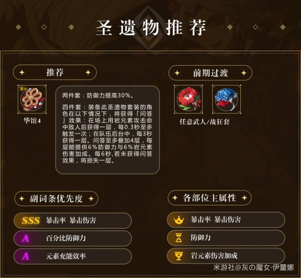 现阶段一斗只有一套成型圣遗物选择,即【华倌梦醒形骸记】四件套,其余套装基本没有考虑的必要。