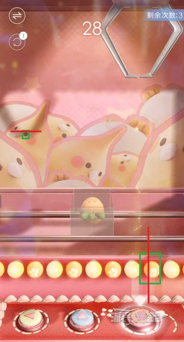 【注释】红线为最合适的位置,绿色方框为误差范围,只要在绿框范围内基本上都可以成功。如果没有1次成功,可以利用左侧的重置来让店员把娃娃还原到最初的位置再重试。