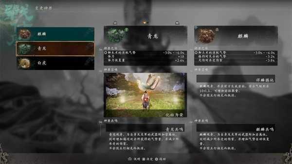 神兽携带会增加一些角色属性,此外还可以释放直接节能或者BUFF技能,直接技能比如初始的麒麟是伤害相当给力的土系石柱,后续每个章节会依次获得青龙、白虎、白泽、朱雀、腾蛇四等神兽,每种神兽的技能也都不一样,比如麒麟就是直接打出一次带高额削气势条效果的倒地,在随便输出一下,就可以打出第一次处决,青龙则是回复状态、白虎是出来打架等等。