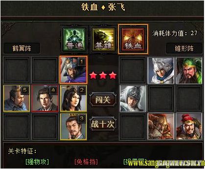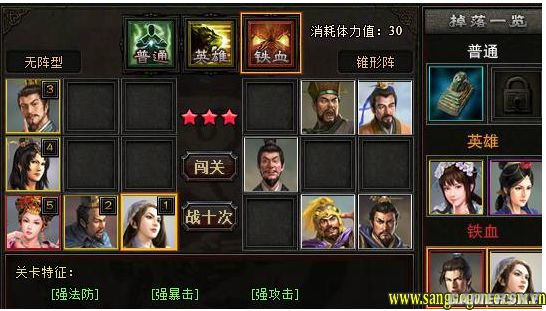 以前听说第十六章是有多么难,好多人都卡在那了,昨晚试了下,没想到普通全三星通关了,有几个要点:先秒掉夏侯或其它主力敌将,多用暴击阵,或是搭配一星董卓提高暴率,我之前多次使用的L型阵也不错,具体布阵我也没有记录,只知道不要怕把郭嘉和陈宫放前方,就算运气不好,顶多再试一次,一般两次中最少会有一次郭嘉等暴击将是可以免疫掉伤害的。
