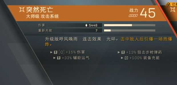 而我们还要选择另一些词条:100%装备充能(【突然死亡】这个技能,尽量找这个词条,它可以额外增加1次:【突然死亡】的使用次数)。