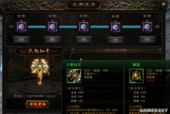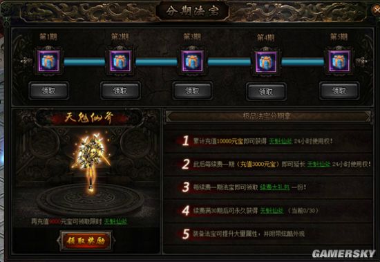 各位道友进入游戏就能看到屏幕左边的分期法宝,就会发现本文介绍分期购的主角——天魁仙斧。没有等级限制,没有VIP限制,没有战力限制,刚进去游戏的新手玩家想要快速获得高级法宝,这个就千万不要错过,只需累计充值10000元宝就可以获得天魁仙斧24小时的使用权。此后一共有30期需要续费,每一期充值3000元宝即可延长宝物24小时的使用权以及获得续费大礼包一份,续费满30期后,您就获得了天魁仙斧的永久使用权。