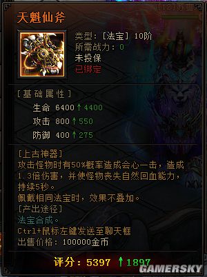 相信很多玩家在玩封天的时候都遇到战力不足,无法佩戴高阶武器的烦恼,有了好武器却无法使用真的是一件很烦恼的事,慢慢提升战力,又让人心烦,那就一定不能错过天魁仙斧。这是一款没有战力要求的10阶上古神器,攻击怪物会有50%的几率触发会心一击,造成1.3倍的伤害,甚至可以使怪物丧失自然回血能力,这个在打斗中有非常大的帮助。各位道友注意哦,只有在分期法宝这里,才可以得到这款特别的神器。