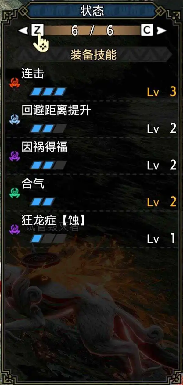 带一级狂龙化的优点非常大,在回血方面代替垃圾孔位的爵银龙腰,也能提高怨恨的时间占比,另外客服狂龙化后的20会心相当于一孔顶四等效达人,解放了大量孔位,同时克服狂龙还能触发转福,进一步提高攻击力,配装和技能图如下。