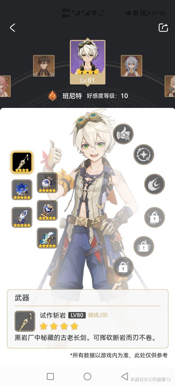 第一种配队,三位辅助圣遗物和武器都容易成型,其中班尼特要注意一下充能效率的堆积,这四名角色就班尼特需要不断放大,其余三位随缘就行。