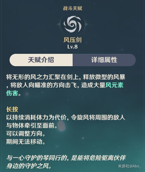 不管你是想作为主C还是想作为速切副C都是推荐优先升级元素战技-风压剑,一是目前的深渊环境和版本走势用不到那么高等级的奶量,二是琴的大招释放需要的能量即便是吃到固有天赋2之后也需要64点能量,并且CD长达20秒,并不能频繁释放,但是风压剑确的的确确的可以频繁释放并且倍率也非常不错。所以推荐优先升级风压剑,其次才是元素爆发