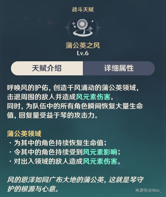 琴的元素爆发会基于自身攻击力加成给队伍中所有角色恢复血量,在瞬间恢复量上是目前所有角色中恢复最多的,并且生成一片蒲公英领域,会周期性造成领域内扩散反应,扩散敌人身上的属性附着,或者扩散角色角色自身身上的debuff附着,使其消失,如: