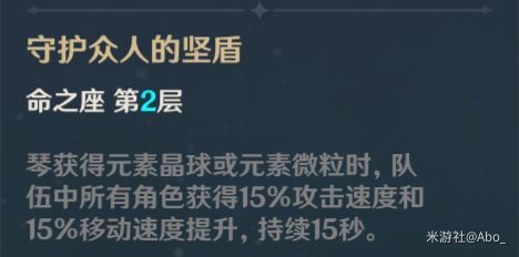 二命是对全队的一个提升,基本可以保持常驻15%的攻速和15%的移速,可帮助队伍提升整体的输出,不过需要注意的是必须是琴自己获得元素晶球或者元素微粒,在速切阵容中由于经常需要频繁切换角色尝尝导致实际吃到元素晶球的不是琴,此时是无法触发二命效果的哦