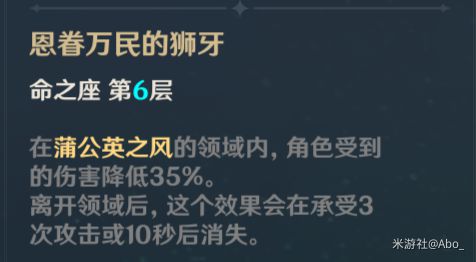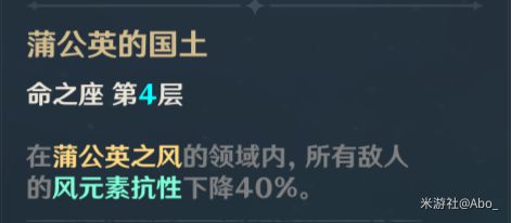 琴的核心命座之一,大招领域内敌人风抗下降40%,尊贵的减抗乘区,不仅是对琴自身E技能提升,亦或是队伍中其他风系角色的提升都很大,配合双风阵容效果非常显著
