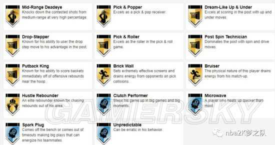 紫水晶布泽尔拥有强壮的身体(94力量)和扎实的内线脚步(92背打、92勾手、92后仰),而且三个挡拆金章(挡拆投篮手、掩护达人、铜墙铁壁)也将大大提升他的挡拆质量,挡拆外弹之后进行中投(93)将成为布泽尔的主要得分手段。