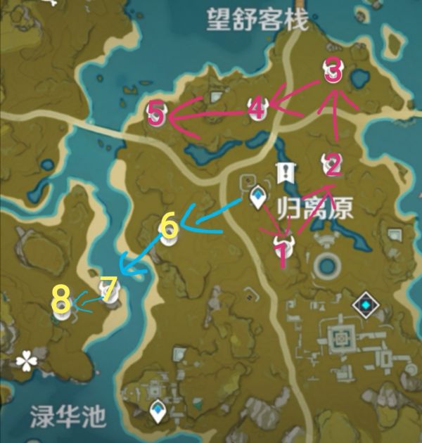 分上下两个路线(红色为上路,蓝色为下路)总共8处丘丘萨满。