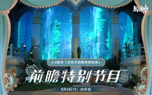 《原神》4.0版本「仿若无因飘落的轻雨」前瞻特别节目于2023年8月4日(周五)晚19:30正式开启。本次特别节目将在B站直播间、斗鱼直播间、虎牙直播间、快手直播间、抖音直播间等直播间同步开播。本次特别节目将为大家带来4.0版本的更新内容,直播间内还有兑换码等福利“掉落”。