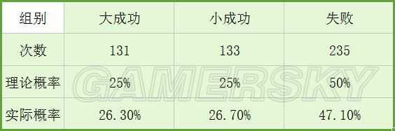 按照复制道具或底座,在这里将结果分为三类:大成功、小成功、失败