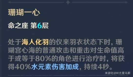 开启大招,治疗80%以上血量的角色就会获得40%的水伤,持续四秒。