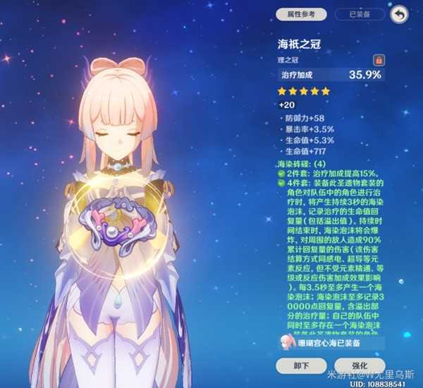 我的心海培养路线是往,增伤,挂水,治疗,输出的方向发展。圣遗物提供伤害,大招提供治疗和输出。挂水能力在永冻队是十分的舒服。