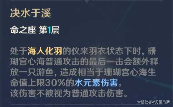 处于大招状态下,心海普攻最后一击会额外放一条游鱼,照成30%的水伤害。这个伤害不看做普通攻击。