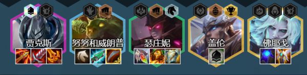 阵容推荐:泰坦、猪妹、人马、努努、武器、芮尔、盖伦、佛耶戈