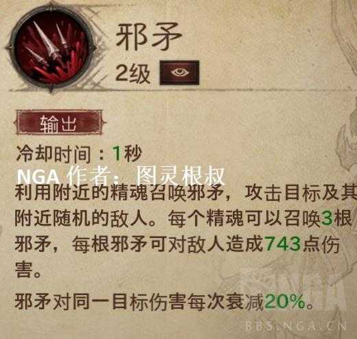 邪矛伤害会递减,假如第1根伤害为100,第2根80,第3跟64,...第9根伤害只有17伤害了,前3根邪矛的伤害加起来有244,9根伤害加起来有433,也就是说只要有3个以上的精魂,对同一个目标最多造成4.33倍的面板伤害,属于单体伤害非常高的技能了