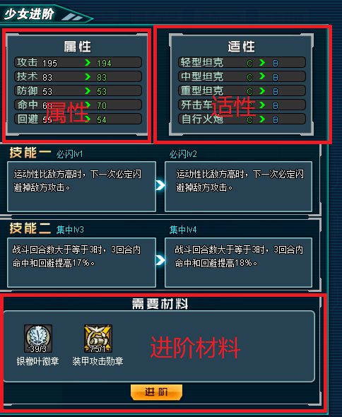 不同的少女随着进阶次数的增长,适性等级也就越高。适性高低可决定少女在对应的战车上发挥的属性,例如适性为D的少女只能发挥对应坦克的60%性能。