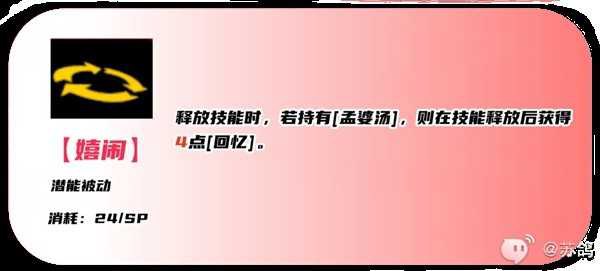 潜能被动技能,潜能(突破)1级后解锁,释放【孟婆汤】增益的技能,可以获得额外的【回忆】层数。
